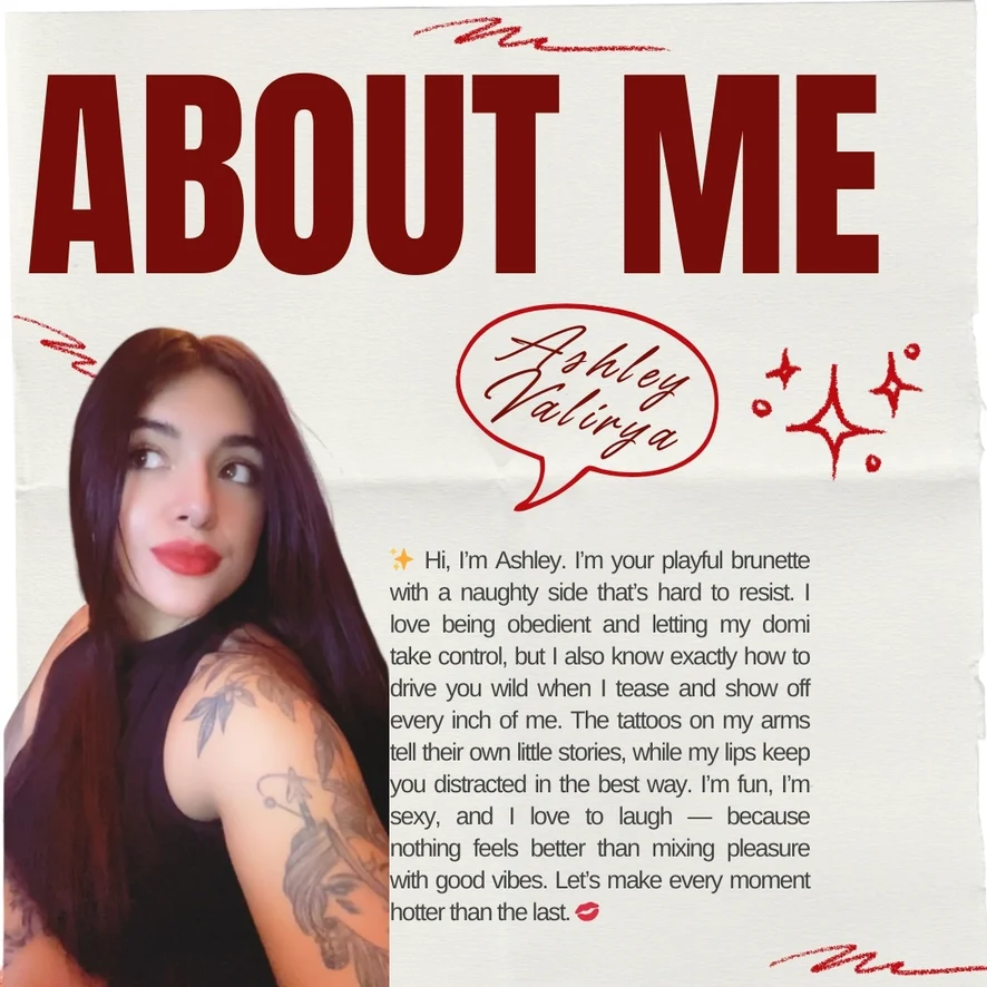 ✨ Hi, I’m Ashley. I’m your playful brunette with a naughty side that’s hard to resist. I love being obedient and letting my domi take control, but I also know exactly how to drive you wild when I tease and show off every inch of me. The tattoos on my arms tell their own little stories, while my lips keep you distracted in the best way. I’m fun, I’m sexy, and I love to laugh — because nothing feels better than mixing pleasure with good vibes. Let’s make every moment hotter than the last. 💋